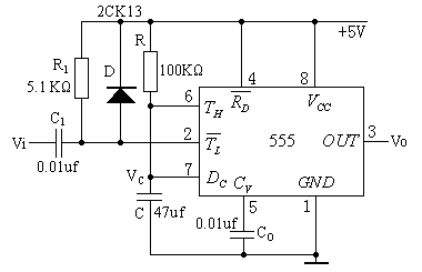 上圖8-2為由555定時器和外接定時元件R、C構成的單穩(wěn)態(tài)觸發(fā)器。D為鉗位二極管,穩(wěn)態(tài)時555電路輸入端處于電源電平,內部放電開關管T導通,輸出端Vo輸出低電平,當有一個外部負脈沖觸發(fā)信號加到Vi端。并使2端電位瞬時低于