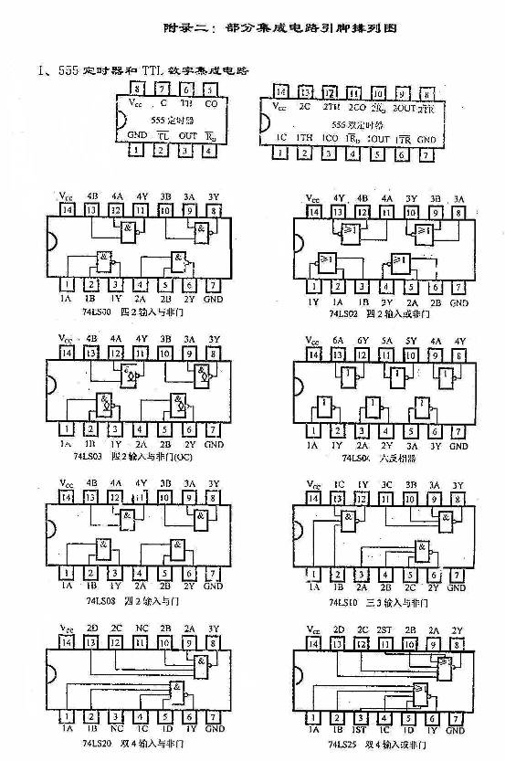 常用集成電路引腳排列圖:包括了,555定時器和TTL數(shù)字集成電路引腳排列圖,74系列集成電路引腳排列圖,CMOS集成電路引腳排列圖等.