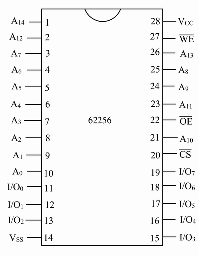 62256分別是32 K×8的高集成度的隨機(jī)存取存儲(chǔ)器,有28個(gè)引腳,采用雙列直插式結(jié)構(gòu),62256的引腳分布如圖2.7所示。它們的內(nèi)部結(jié)構(gòu)與6264類似,也是由存儲(chǔ)器陣列、行/列地址譯碼器以及數(shù)據(jù)輸入輸出控制邏輯組成。引腳功能和外部特性與6264基本相同,區(qū)別僅在于由于容量大,第26引腳為A13第1引腳為A14。
