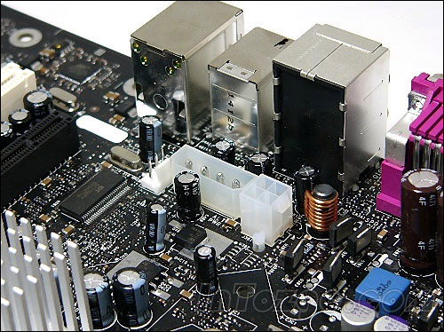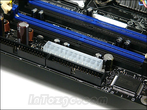 20針電源安裝到上面,會空出4個(gè)接口。如果您熟悉服務(wù)器產(chǎn)品的話應(yīng)該都知道,這種24針接口電源一直用在服務(wù)器上,現(xiàn)在915/925平臺把它引進(jìn)過來,應(yīng)該是為了PCI Express X16接口做電源供應(yīng)。根據(jù)資料來看,PCI Express X16接口最高可以應(yīng)用75W功耗的顯卡,其中一部分電力應(yīng)該就是由這種服務(wù)器電源額外提供的。