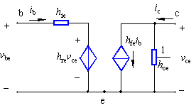 式(2)表示輸出回路方程,它表明輸出電流ic由兩個(gè)并聯(lián)支路的電流相加而成,一個(gè)是由基極電流ib引起的ic=hfeib,用電流源表示;另一個(gè)是由輸出電壓加在輸出電阻1/hoe上引起的電流,即