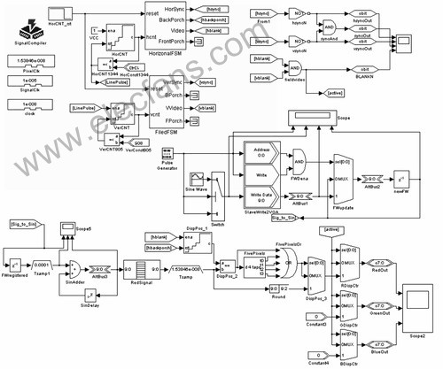 借助于DSP Builder中的Signal Complier模塊,可以容易地將設(shè)計(jì)完成的系統(tǒng)直接轉(zhuǎn)化成RTL級的硬件描述語言,在QuartusⅡ下完成VGA時序的驗(yàn)證與正弦波信號的下載與顯示。??