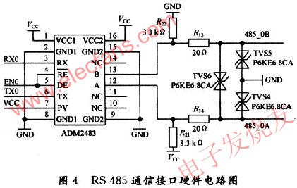為實現(xiàn)底層多采集模塊和上位機間遠距離通訊,在底層采用RS 485總線進行數(shù)據(jù)傳輸。因PC機端的串口是RS 232接口,故需在PC端接專用的RS 232/RS 485轉(zhuǎn)換模塊將RS 232信號轉(zhuǎn)換成RS 485的信號。本采集單元使用通訊模塊芯片為帶磁隔離的ADM2483,采用工業(yè)標(biāo)準(zhǔn)協(xié)議——MODBUS RTU通訊協(xié)議。圖為RS 485通信接口硬件電路。