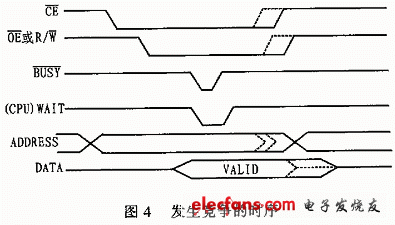 另外,在使用BUSY信號(hào)時(shí)必須首先將此信號(hào)接上拉電阻,其次應(yīng)在BUSY信號(hào)有效期間使處理器保持讀寫(xiě)操作經(jīng)及相應(yīng)的地址和數(shù)據(jù),但是需要說(shuō)明的是:在BUSY信號(hào)變高之前,這種情況下的所有寫(xiě)操作都是無(wú)效的,圖4所示發(fā)生競(jìng)爭(zhēng)時(shí)的時(shí)序圖。