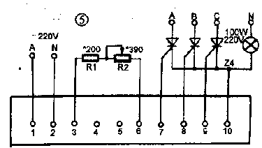 調(diào)試的接線見圖5。暫不接電機(jī),在可控硅的共陽極端Z4和電源零線端接100W、220V白熾燈。在三相四線電源進(jìn)線上任定一相為A相,暫定其它兩相為B、C相。在⑧⑧端接固定電阻R1及可調(diào)電阻R2,其余按圖接三相電源。