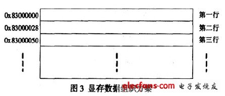 對(duì)于雙色屏, 一個(gè)像素點(diǎn)需要紅、綠兩位數(shù)據(jù)來描述。為了便于處理, 我們將橫向連續(xù)的8 個(gè)像素點(diǎn)組成一個(gè)字(2byte)來進(jìn)行存儲(chǔ), 其中一個(gè)字節(jié)為紅數(shù)據(jù), 一個(gè)字節(jié)為綠數(shù)據(jù)。數(shù)據(jù)存儲(chǔ)順序?yàn)閺淖蟮接遥?從上到下。如圖3 所示, 假如屏幕寬度為160 個(gè)像素點(diǎn), 顯存起始地址為0x83000000, 則屏幕第一行的前8 個(gè)像素點(diǎn)映射到顯存中地址為0x83000000 和0x83000001 的兩個(gè)字節(jié), 第二行的前8 個(gè)像素點(diǎn)映射到顯存中地址為0x83000028 和0x83000029 的兩個(gè)字節(jié), 依此類推。