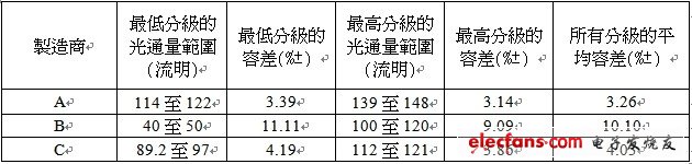 表1:全球前二大光電半導(dǎo)體制造商的高階冷白光LED在350mA和25℃下的光通量分級(jí)結(jié)果