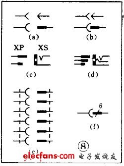 接插件的圖形符號見圖 8 。其中( a )表示一個插頭和一個插座,(有兩種表示方式)左邊表示插座,右邊表示插頭。( b )表示一個已經插入插座的插頭。( c )表示一個 2 極插頭座,也稱為 2 芯插頭座。( d )表示一個 3 極插頭座,也就是常用的 3 芯立體聲耳機插頭座。( e )表示一個 6 極插頭座。為了簡化也可以用圖( f )表示,在符號上方標上數(shù)字 6 ,表示是 6 極。接插件的文字符號是 X 。為了區(qū)分,可以用“ XP ”表示插頭,用“ XS ”表示插座。