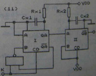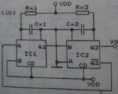 3、圖10為用CD4528雙單穩(wěn)觸發(fā)器構(gòu)成的占空比和頻率可調(diào)的多諧震蕩器。