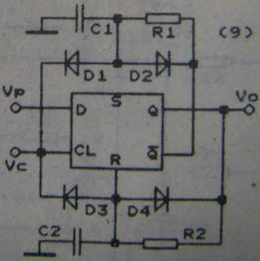 2、圖9是用D觸發(fā)器組成的相位控制和占空比可調(diào)的多功能震蕩器,具有起振和停振控制;VC為起振;VP為高時V0就為高,為低時V0就為低,原理和圖8似。