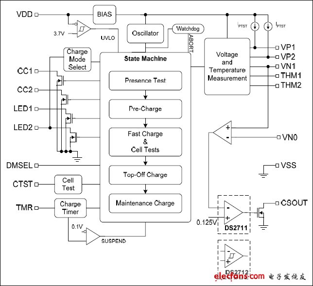 DS2711和DS2712適用于對系統(tǒng)中或獨(dú)立的1或2節(jié)AA或AAA NiMH標(biāo)準(zhǔn)電池充電。通過監(jiān)控溫度,電壓和充電時間實(shí)現(xiàn)最佳鎳氫(NiMH) 電池快速充電控制。電池測試包括檢測失效或不匹配的電池,如一次性堿性電池。DS2711/DS2712支持串聯(lián)和并聯(lián)拓?fù)?,對每?jié)電池進(jìn)行獨(dú)立的檢測和控制。同時還支持對NiCd化學(xué)電池充電。