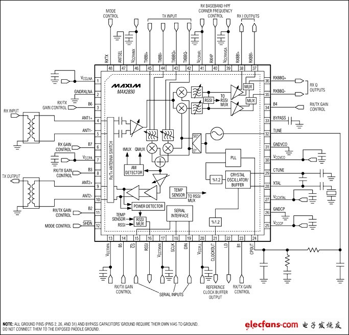 MAX2830直接變頻、零IF RF收發(fā)器設(shè)計(jì)用于2.4GHz至2.5GHz 802.11g/b WLAN應(yīng)用。MAX2830完全集成了實(shí)現(xiàn)RF收發(fā)器功能所需的全部電路,提供RF功率放大器(PA),Rx/Tx和天線切換開關(guān)、RF至基帶接收通道、基帶至RF發(fā)射通道、壓控振蕩器(VCO)、頻率合成器、晶體振蕩器和基帶/控制接口。MAX2830包含具有快速建立時(shí)間的Σ-Δ RF合成器,具有小于20Hz的頻率步長和數(shù)字調(diào)諧晶體振蕩器,允許使用低成本的晶體。該器件無需I/Q校準(zhǔn);但是該器件集成了片內(nèi)DC偏移消除和I/Q誤碼以及載波泄漏檢測(cè)電路,以提高性能。僅需RF帶通濾波器(BPF)、晶體、一對(duì)非平衡變壓器和少量的無源器件即可構(gòu)建完整的802.11g/b WLAN RF前端解決方案。