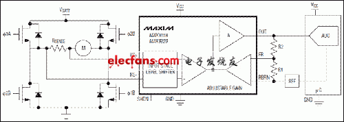 MAX9918/MAX9920通過外部電阻分壓網(wǎng)絡(luò)調(diào)節(jié)增益設(shè)置,MAX9919具有45V/V (MAX9919F)和90V/V (MAX9919N)的固定增益。VREFIN = GND時(shí),MAX9918/MAX9919/MAX9920工作在單向放大器配置;VREFIN = VCC/2時(shí),工作在雙向放大器配置。MAX9920在輸入電平轉(zhuǎn)換級將輸入信號衰減4倍,使器件能夠檢測高達(dá)200mV (單向工作)或±100mV (雙向工作)的電壓。